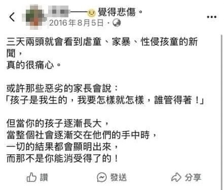 身為擁有5個孩子的宋女,狠心虐死別人的孩子,新聞曝光後,網友湧入她的臉書粉專撻伐,她在2016年的文章也被挖出,內容提及「三天兩頭就會看到虐童、家暴、性侵孩童的新聞,真的很痛心。」她還提到「或許那些惡劣的家長會說:『孩子是我生的,我要怎樣就怎樣,誰管得著!』」對比現況,形同重重打臉。