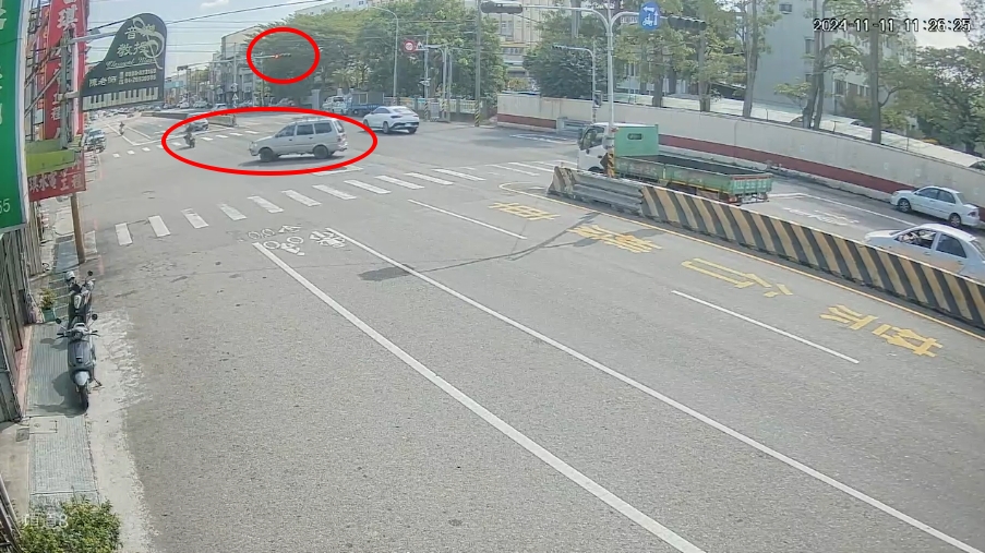 根據監視器畫面,廂型車當時紅燈,正在等待綠燈右轉,不過左轉燈尚未亮起,廂型車就已先左轉,此時對向一輛機車高速直行,當場與廂型車對撞,騎士噴飛後倒地不起,機車零件也四散一地,廂型車同樣車殼受損嚴重,往前滑行數公尺。