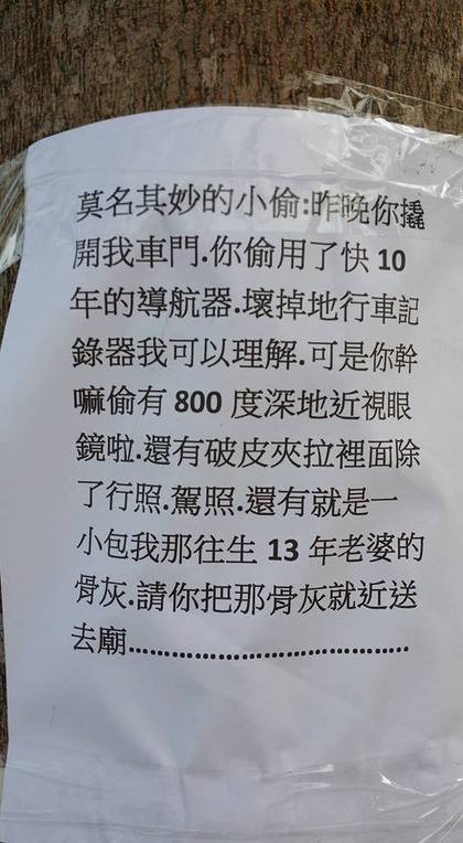 行竊案件,事後車主也在事發地點張貼了一張公告,從照片中可看到,公告上面寫著「你偷了用了快10年的導航器、壞掉的行車紀錄器我可以理解,可是你幹麻偷有800度深的近視眼鏡,還有破皮夾」,直到最後一行,讓原PO看了簡直驚呆了,因為車主在公告最後向小偷表示「裡頭有一包我那往生13年老婆的
