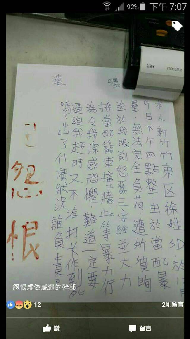 ▲徐姓司機疑似因為壓力太大,除了用原子筆寫下控訴外,還用血在最後留下「怨恨」二字(圖/翻攝網路)