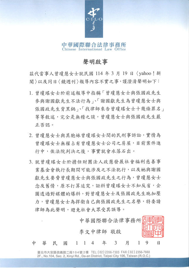 針對近期媒體報導提及曾瓊慧與張國政涉入謝國獻案件的指控,曾瓊慧及張國政透過中華國際聯合法律事務所發表律師聲明,嚴正否認相關指控,並強調該報導內容不實,企圖誤導社會大眾。曾瓊慧表示,相關指控純屬無稽之談,現階段已進入司法程序,靜待法院裁決。