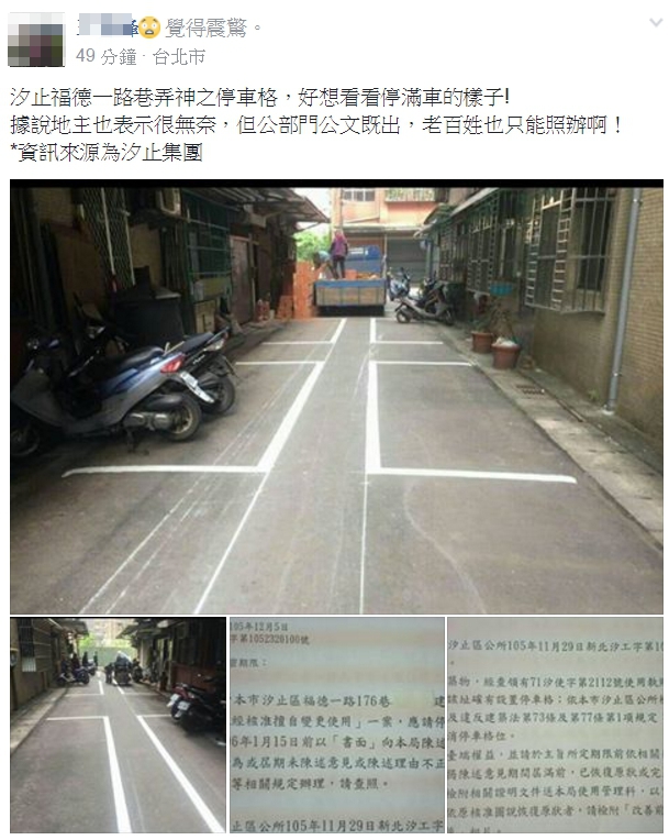 這名網友表示,照片中的停車格位於汐止福德一路巷弄中。當地地主因為公部門已經發出公文,所以必須照公文中規劃重新塗上停車格,「據說地主也表示很無奈,但公部門公文既出,老百姓也只能照辦啊!」在網友PO出的