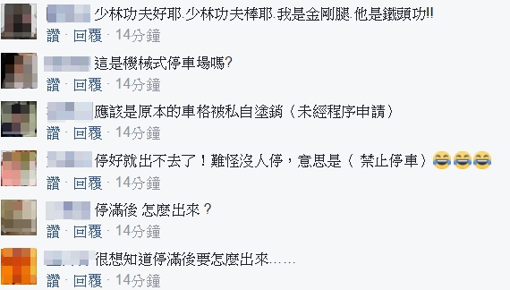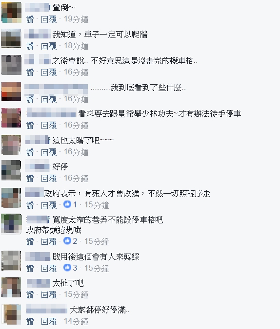 網友看到這篇PO文後紛紛留言:「變形金剛專用...」、「出事後,又會有一張紙說:承辦人員已受懲處,一切依法行事」、「停滿了到時候又影響消防了」、「如果一台機車從中間過,四部車的烤漆就gg了…」、「1.3.5左邊開放,2.4.6右邊開放,星期日停滿?」、「既成道路,你是地主也只能投降了,馬路鋪了就代表充公了」。