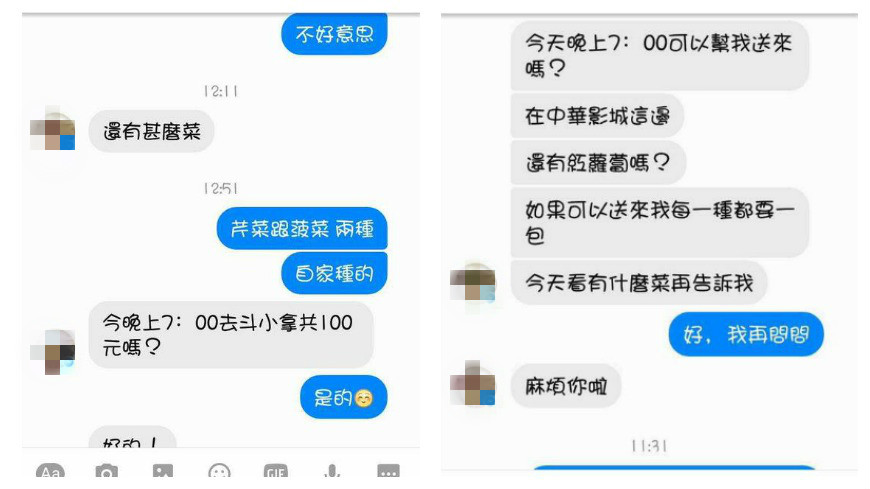 一名女網友在臉書社團《爆料公社》PO文,表示自己平常幫助農民爺爺奶奶販售自己栽種的蔬菜。日前雲林一位女老師透過私訊和她訂購了1袋芹菜和1袋菠菜,談好價錢後確定2袋蔬菜共100元。從網友PO出的對話圖片中可以看到,女老師和網友約定好面交地點和時間。而原本十分彬彬有禮的女老師甚至還表示「如果可以送來我每一種都要一包」,沒想到面交時卻立刻翻臉,讓網友超級傻眼!
