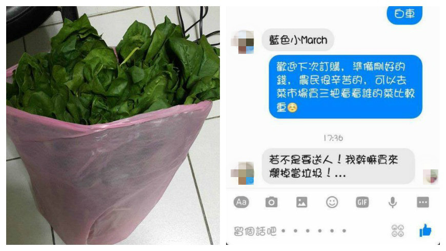 網友將菜送到面交地點後,女老師認為菜的量並沒有她想像中的多,直接怒嗆「這種量敢賣50元喔,外面3把才50元」,甚至表示「我只帶80元,你就算80元,趕時間先走!」事後網友她和女老師委婉表示「農民真的很辛苦,若不相信可以去菜市場買3把來比重量」,沒想到女老師卻回覆「若不是要送人,我幹嘛買來爛掉當垃圾!」