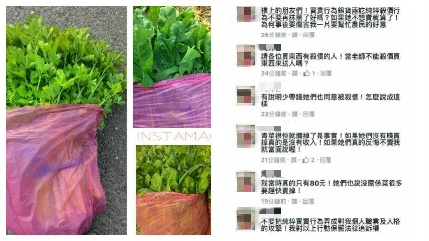 該名女老師的臉書也遭到網友批評洗板灌爆,不料她竟然出來霸氣回應網友批評,表示當時自己身上真的只有80元,而且買賣行為銀貨兩訖,她只是純粹的殺價行為。面交時女網友也同意她殺價,青菜快要爛掉要趕快售出也是事實,不要事後傷害她幫助農民的一番心意。她也說:「當老師不能殺價買東西來送人嗎?」