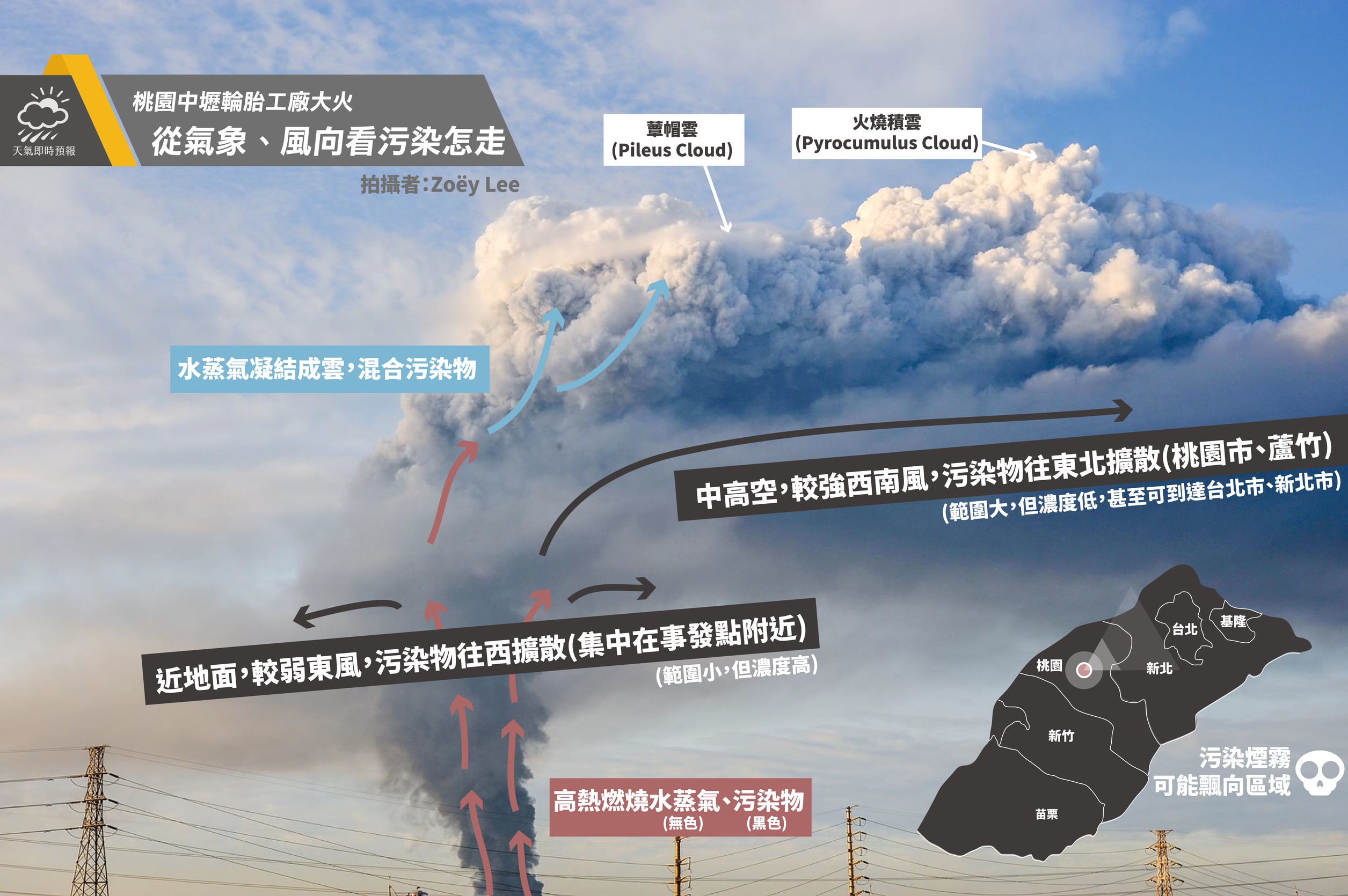 因為這場大火,濃濃的黑煙直竄天際,形成了壯觀的積雲,但是輪胎燃燒後會產生戴奧辛、一氧化碳、一氧化硫等有害物質,恐會引發氣喘,對人體造成危害。許多人就擔心這樣的空汙會不會到處飄散,而「天氣即時預報」就製作一張圖表,從氣象、風向的角度,講解汙染物會怎麼走,其中高污染的地區有「中壢區、平鎮區」;中汙染的地區有「桃園市、桃園區、蘆竹區、龜山區」;而低汙染的地區有「新北市、台北市」。