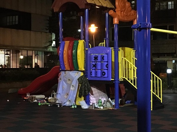 露營」還佔地為王太誇張!一名台北市女網友表示,自己的小孩21日晚間到大安區四維路上的德安公園玩耍,不料竟然有一群人霸占了公園中的溜滑梯,甚至還大聲嚇阻其他民眾和小朋走不要靠近。這群人在溜滑梯下的空地擺放雜物和食物,疑似在野餐或是露營,根本是把公園當自己家!