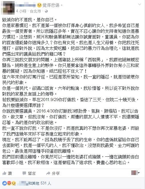 此外,李秀環也控訴「若我要毀滅你,早在2011.9.29你打傷我,昏迷了三天、住院二十幾天後,為什麼還要選擇原諒?」、「2016.4.30你打斷我3根肋骨、氣胸、肺塌陷,我可以告你,做文章,但我沒有,你打傷我,周遭的朋友人人憤憤不平,我還要隱忍著,為的是你的政治前途」。