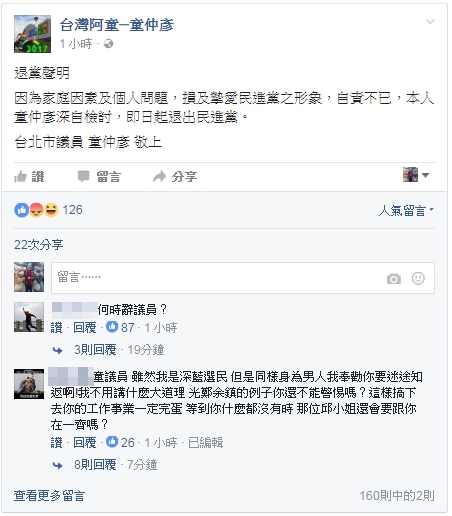因為家庭因素及個人問題,損及摯愛民進黨之形象,自責不已,本人童仲彥深自檢討,即日起退出民進黨。