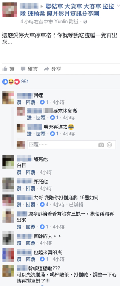 照片PO上臉書社團「聯結車大貨車大客車拉拉隊運輸業照片影片資訊分享團」後,引起網友迴響:「好療癒的畫面」、「神車駕駛大部分都是神人啊」、「大哥,我陪你打個麻將,16圈如何」、「包起來真的爽」、「可以先洗個澡、喝杯熱茶、打個盹,調整一下心情再挪車好了」、「關廁所」、「至少要睡滿八個小時吧!然後吃個飯玩個遊戲看能不能提水擦個車之類的」。