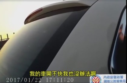 內政部警政署國道公路警察局今(7日)在臉書公布攔查女駕駛影片,其中可見警察當時測得內側車道白車時速僅77公里後,立刻驅車前往攔查。女駕駛下車後表示自己開車時速達100公里,卻立刻被警察戳破。她見情勢不利後又改口求情:「我要慢慢加速啊」,反遭警察當場告誡:「妳不要慢慢加速,妳不能占用內線。」