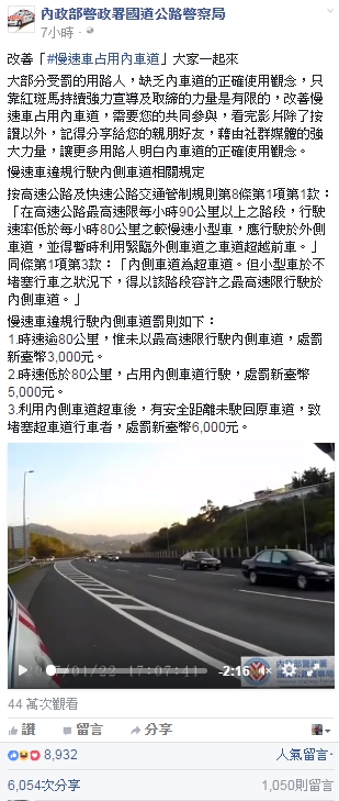 ▼國道公路警察局在臉書PO出完整攔查影片,並呼籲民眾要注意內車道使用觀念(圖/翻攝內政部警政署國道公路警察局臉書)