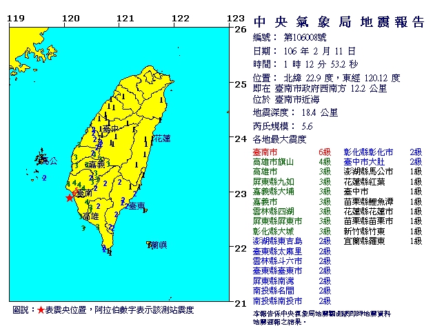 地震,台南和高雄地區傳出災情。這次地震震度主要分布在台南、高雄地區,台南市最大震度達到6級,高雄達到4級。地震後有發生兩個小區域的地震,氣象局指出,目前餘震並不多,但未來一周還需要注意有感地震的發生。