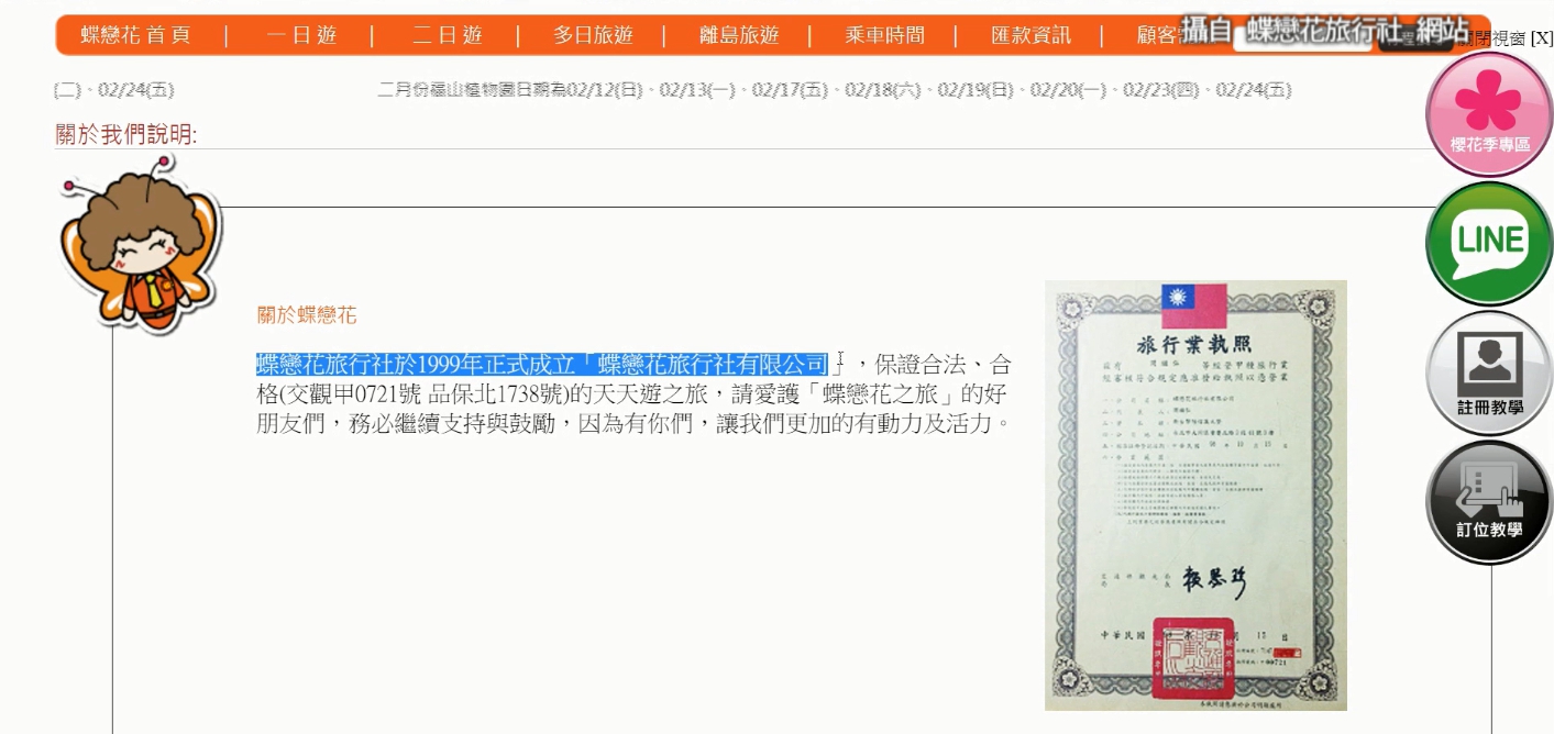 據了解,蝶戀花旅行社主打國內旅遊,一日行程價格多在1000元以下,以「俗又大碗」吸引民眾消費。從官網中顯示,武陵農場賞櫻團分有850元和1100元兩種行程價碼,差別在有沒有含中餐。另外,蝶戀花旅行社行程路線還包含八角棟山一日遊、佛光大學一日遊、雲林台灣燈會一日遊、武陵農場櫻花季或九族文化村等等,最貴價格約為1100元。