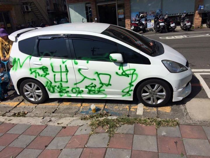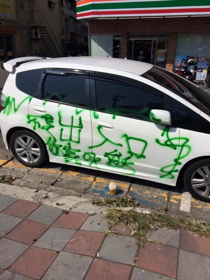 有網友在臉書爆料公社PO文表示,今(19日)早上,桃園平鎮某公園,有一台被噴得亂七八糟的白色轎車,就停在劃紅線的斜坡出入口,疑似因為擋到推輪椅和嬰兒車,被民眾噴漆警告。