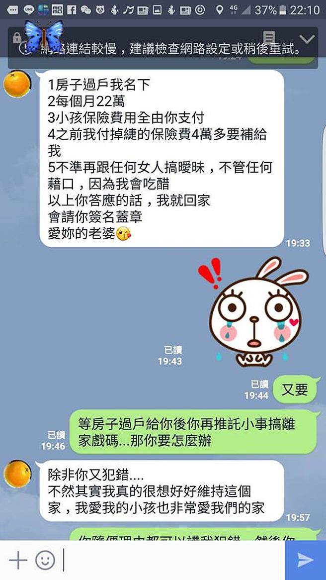 該男網友無奈表示,第一點:過戶可以,但是貸款必須老婆自己繳;第二點:家用改為20萬,自己月薪只有20萬,怎麼可能拿得出22萬元;而第三、四點:則因為要保人一直是妻子,叫她改成丈夫的名字又不願意,而且實際上幾年來他也付出了超過300萬元的保費。只有第五點:男網友表示沒問題。