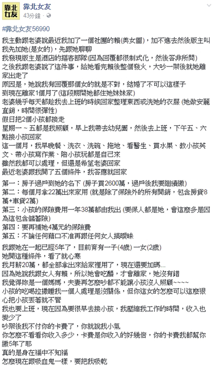 該男網友表示,跟老婆在一起已經5年了,目前育有一子(4歲)一女(2歲),老婆離家逾月,原因就是丈夫與酒店摳客妹傳LINE,日前竟開出了5項復合條件: