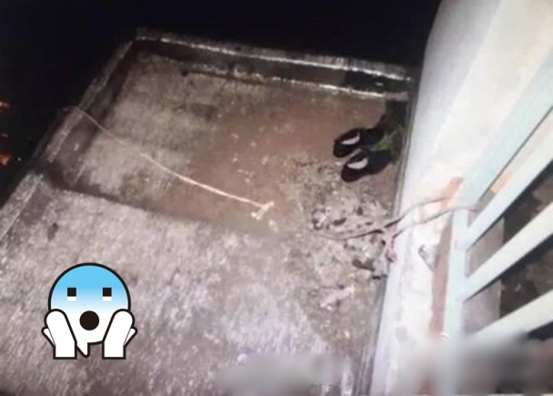 ▼現場窗戶綁有一條麻繩,以及疑是死者曾穿着的皮鞋。圖/東網