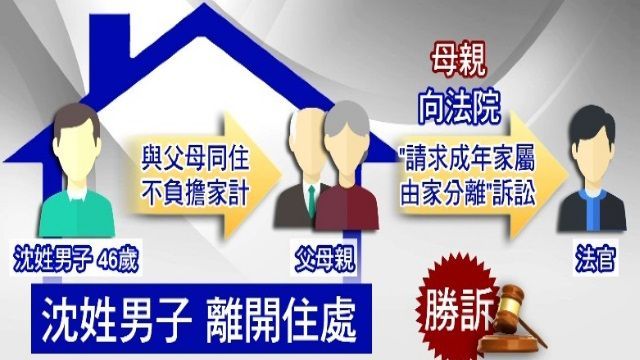 天下父母親養兒育女,當兒女長大後家長當然不希望孩子變成沒工作、只待在家裡要錢的「啃老族」,父母可以循求法律救濟。新北市一名已經46歲的沈姓男子只知要錢卻不願扶養父母,母親向放院提起「請求成年家屬由家分離」的訴訟,判決勝訴。兒子必須離家自力更生,否則將被法院強制執行。