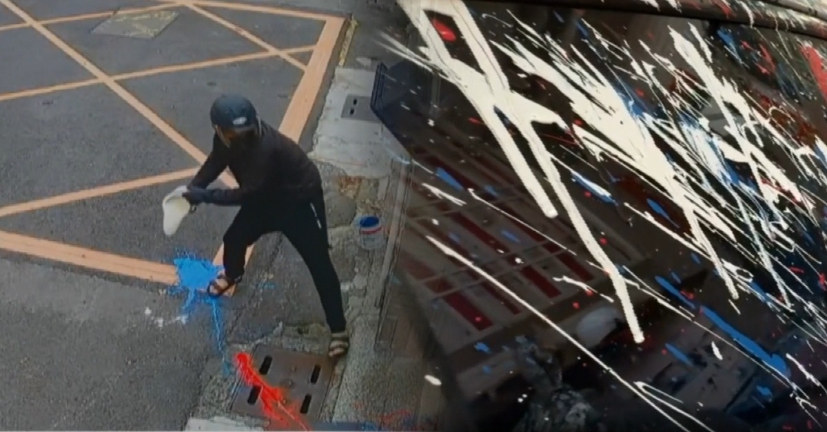 透天厝一樓,白色車子上全是油漆,旁邊的牆壁地板也都是。往旁邊看,三輛機車上防塵套全都是漆,連安全帽、裡頭的玻璃窗也都是。女屋主一開家裡的門,男子就朝著她潑漆,還潑到門內地板。潑漆的人就是這名黑衣男子,他帶著四桶油漆,特地等女屋主開門時潑。