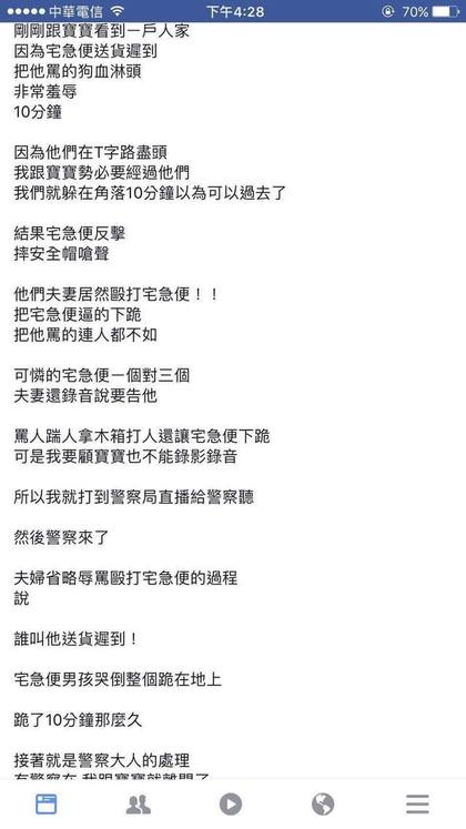 原PO指出,當時他返家時,因夫婦倆與宅配員發生糾紛擋道,他只好先暫停在一旁等待,後來發現原來是因為宅配員送貨遲到引起夫婦倆不滿,便以難聽字句謾罵宅配員,後來宅配人員摔安全帽嗆聲反擊,但夫婦反而動粗踹人,甚至還說要錄音告對方,逼得宅配員跪趴在地,不斷痛哭討饒長達10分鐘。