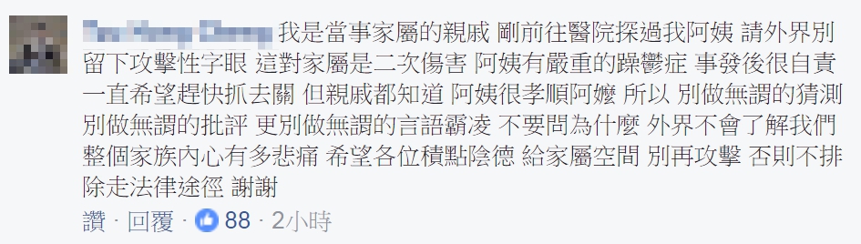 而面對網友的質疑聲四起,有當事人的親戚出面表示,這位張姓婦人就是自己的阿姨,他才剛前往醫院探,並且指出,「阿姨有嚴重的躁鬱症,事發後很自責,一直希望趕快抓去關,但親戚都知道阿姨很孝順阿嬤」,因此希望外界別做無謂的猜測和批評,因為這對家屬是二次傷害,期盼大家能給家屬一點空間,別再留下攻擊性字眼,否則不排除走法律途徑。