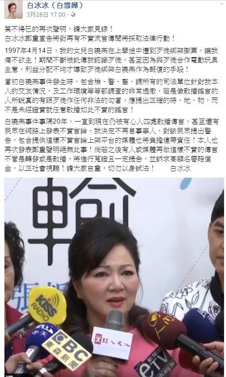 白曉燕事件後,「有心人」曾四處放話,指出白冰冰與陳進興有生意過結,為報復白冰冰才將白曉燕撕票,而這些指控,對白冰冰而言簡直如在傷口上一再撒鹽,她表示那名「有心人」常上電台、談話節目造謠此事,而節目主持人卻也十分可惡,只為創造高收視率而炒作此事,她氣得揚言,「我一定告到底,要求高額賠償。」除此之外,也常有民眾在網路上散播不實言論,她在臉書上申明「倘若之後有人或媒體再做這樣不實的傳言不管是轉發或是散播,將進行蒐證且一定提告,並訴求高額名譽賠償金,以正社會視聽!請大家自重,切勿以身試法!」