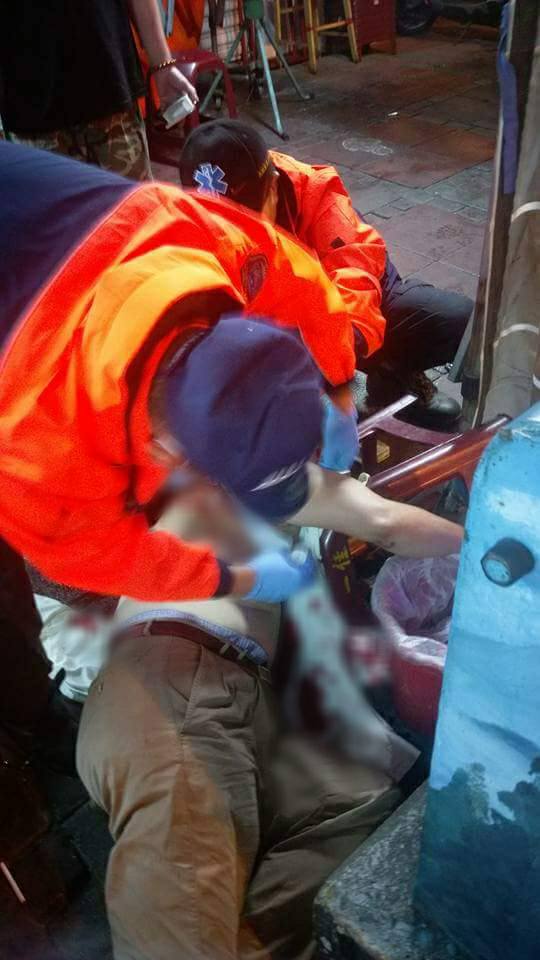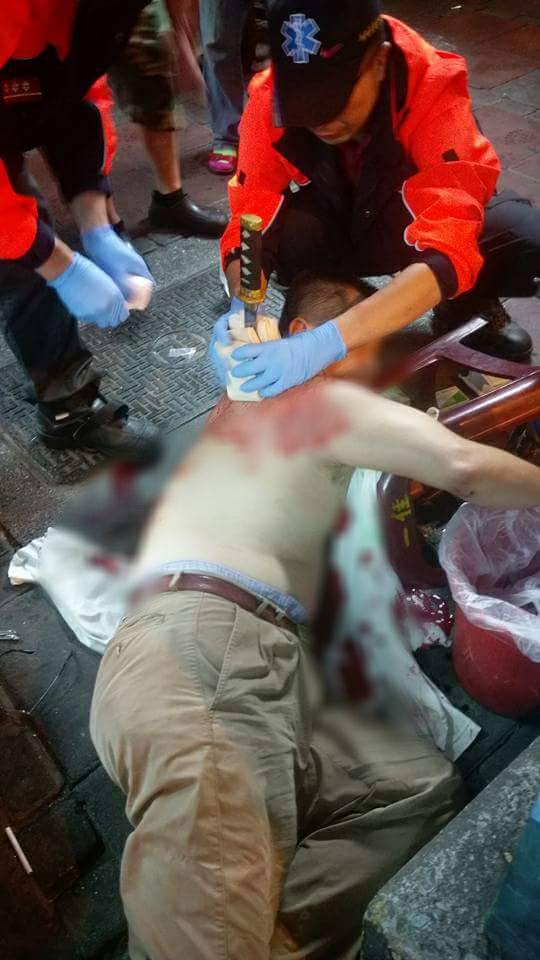 阿伯在酒酣耳熱之際,突然躁動了起來,一瞬間,其中一位阿伯的背上就突然出現了一把武士刀,讓網友不禁問道「到底為了啥事讓三個快要年過半百的人還能這麼衝動?」警察接獲民眾報案後,也到現場了解狀況,醫護人員也緊急對阿伯急救,並將他送醫。