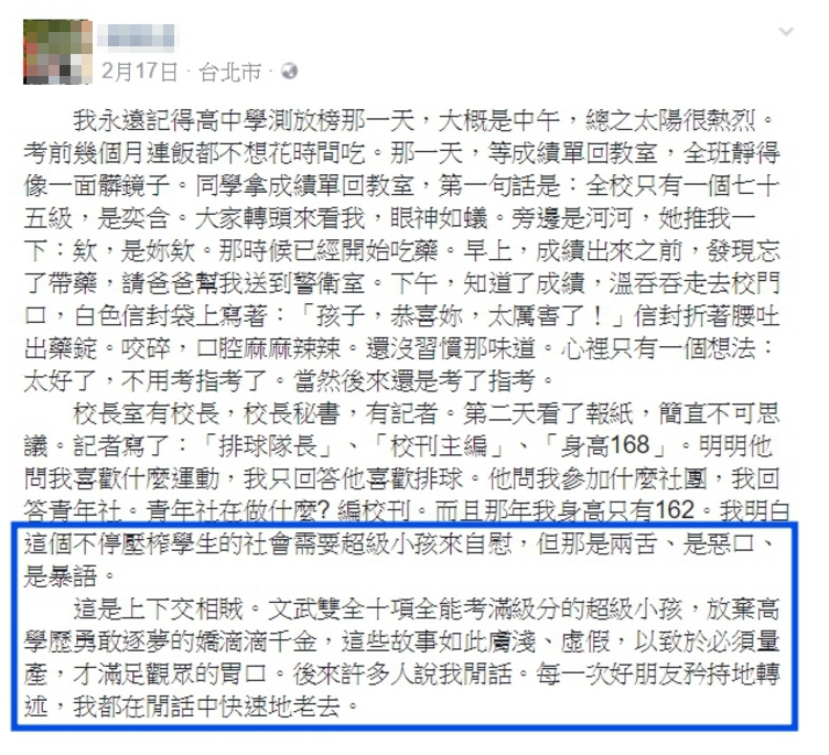 女作家後來從台北醫學院醫學系就讀僅兩個星期後,就休學重考至大學讀中文系,今年2月時還在臉書上PO文回憶當初放榜時的情形,她對媒體的虛偽與造神運動感到無奈,直言「我明白這個不停壓榨學生的社會需要超級小孩來自慰,但那是兩舌、是惡口、是暴語。這是上下交相賊。文武雙全十項全能考滿級分的超級小孩,放棄高學歷勇敢逐夢的嬌滴滴千金,這些故事如此膚淺、虛假,以致於必須量產,才滿足觀眾的胃口。後來許多人說我閒話。每一次好朋友矜持地轉述,我都在閒話中快速地老去。」
