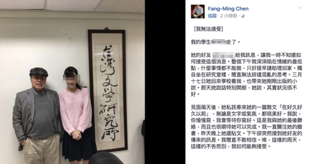 ▼作家陳芳明在得知學生死訊後,於臉書PO文表示「不能接受」(圖/陳芳明臉書)