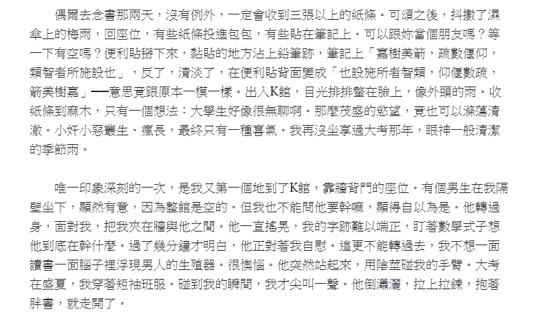 女作家表示,當她第一個進入K書中心時,有位男生先是,「挑她旁邊的空位坐下,接著再轉身面對她」,將她夾在自己與牆壁的中間,然後開始前後晃動,過了幾分鐘,她才意識到,那名男生正對著她在自慰,且更可怕的是,那名男生還突然站起來,用私密處碰了她的手臂,讓她嚇得當場尖叫,隨後該名男子也沒什麼反應,只趕緊拉上拉鍊,就抱著書離開了。