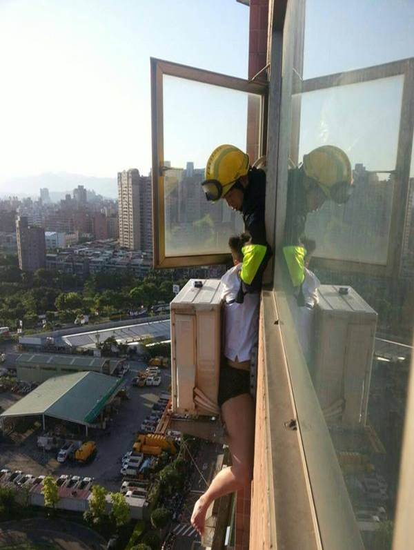 酒醉女子在18樓住處和年約20幾歲的女友吵架,吵著吵著就揚言要輕生,結果酒後神智不清的她跨出窗外時,一個不小心就卡在冷氣室外機和大樓外牆中間,當時她只穿著一件白色短袖上衣和黑色內褲,整個人動彈不得