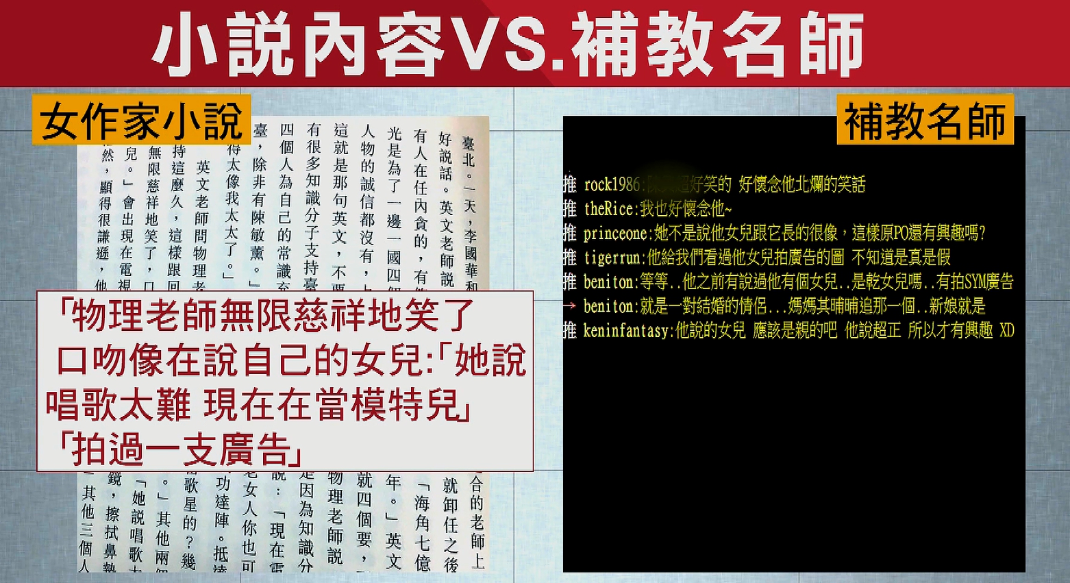 另外,小說中也提到物理老師有一名女兒,當模特兒拍過一支廣告,網友表示曾聽過補教名師提及女兒時,曾說「自己女兒超正」,還說女兒想當「模特」,打算送女兒到「模特兒學校」,而補教名師口中的女兒也曾參加過「少女團體的節目」以及拍過「機車廣告」。