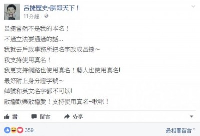 歷史補教名師呂捷總把歷史故事說得活靈活現,相當受學生歡迎,網路上也有不少人分享他的教學影片。針對立委提案修法「禁用假名授課」,呂捷坦承,「呂捷」確實不是他的本名,他還笑說,縱使強迫用真名,但真名就不能改嗎?呂捷接著表示,他支持網路實名制,支持在網路使用真名,藝人也使用真名,「最好附上身分證字號,綽號和英文名字都不可以!」