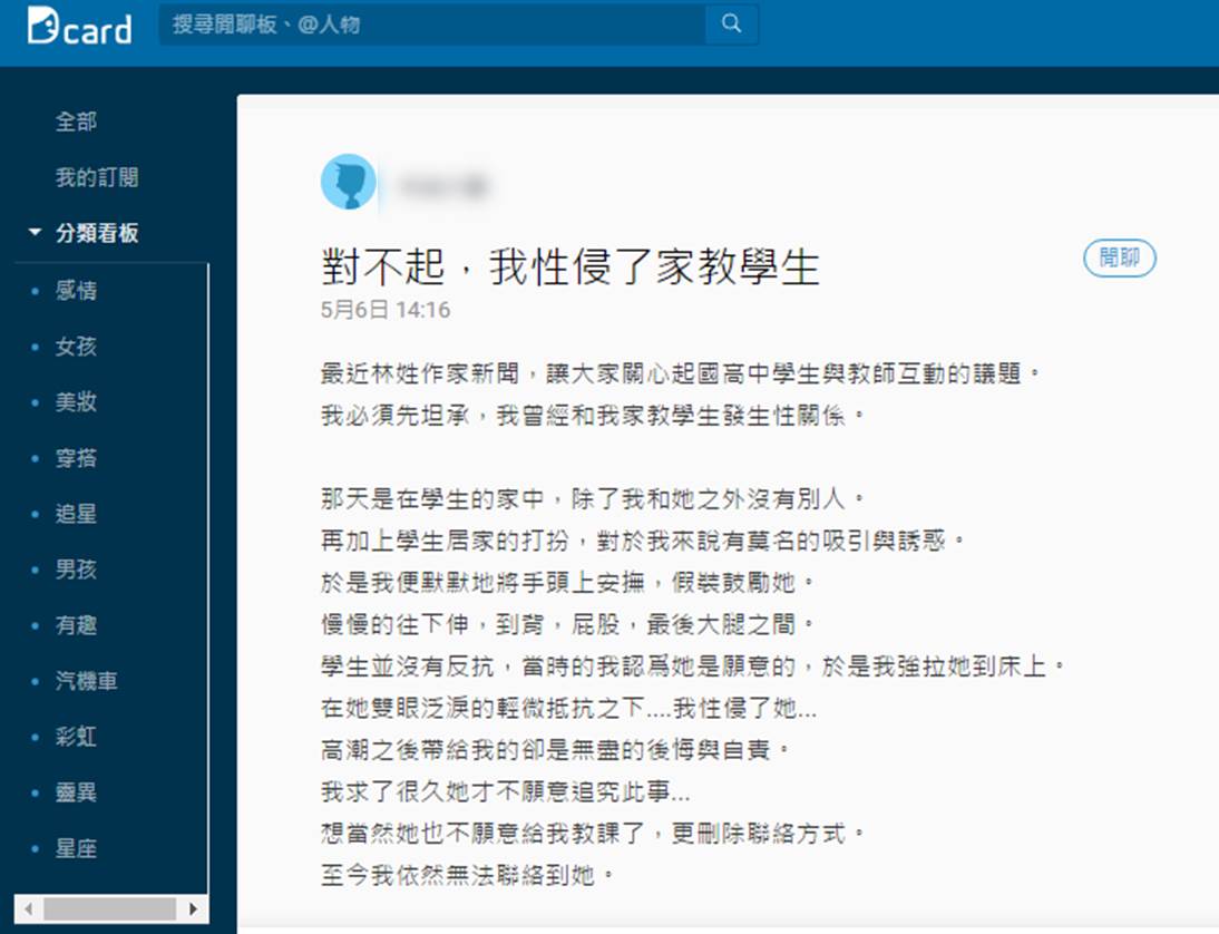 有知名國立大學學生在《Dcard》PO文自白,「我曾經和我家教學生發生性關係」,並且描述當天事發經過,指出他到女學生當家教時,自覺被學生居家的打扮所吸引,接著「我便默默地將手放在頭上安撫,假裝鼓勵她。慢慢的往下伸,到背,屁股,最後大腿之間。…」由於女學生沒有反抗,他以為對方也自願,於是他強拉對方到床上,在對方雙眼泛淚的輕微抵抗之下,他「性侵」了對方。