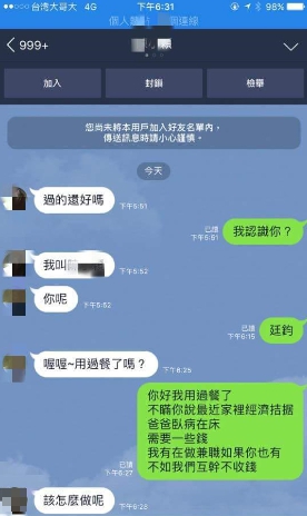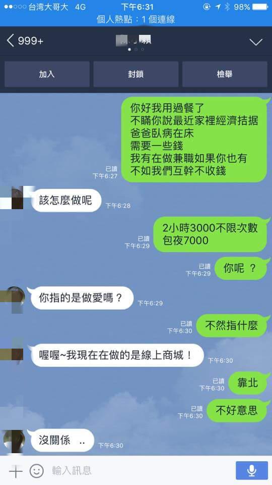 援交的餘地,於是決定自己先出招,便問對方「你好我用過餐了!不瞞你說最近家裡經濟拮据,爸爸臥病在床,需要一些錢。我有在做兼職如果你也有,不如我們互X不用錢!」