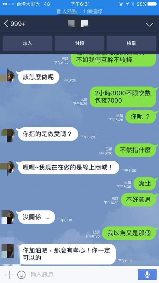 但百過總有一失,原PO怎麼也沒料想到,對方竟然會回「你指的是X愛嗎?」、「我現在在做的是線上商城」,讓原PO瞬間想找個地洞鑽起來,立刻尷尬的道歉「X北!不好意思,我以為又是那個…」對方還笑說「沒關係,你加油吧!那麼有孝心,一定可以的!」