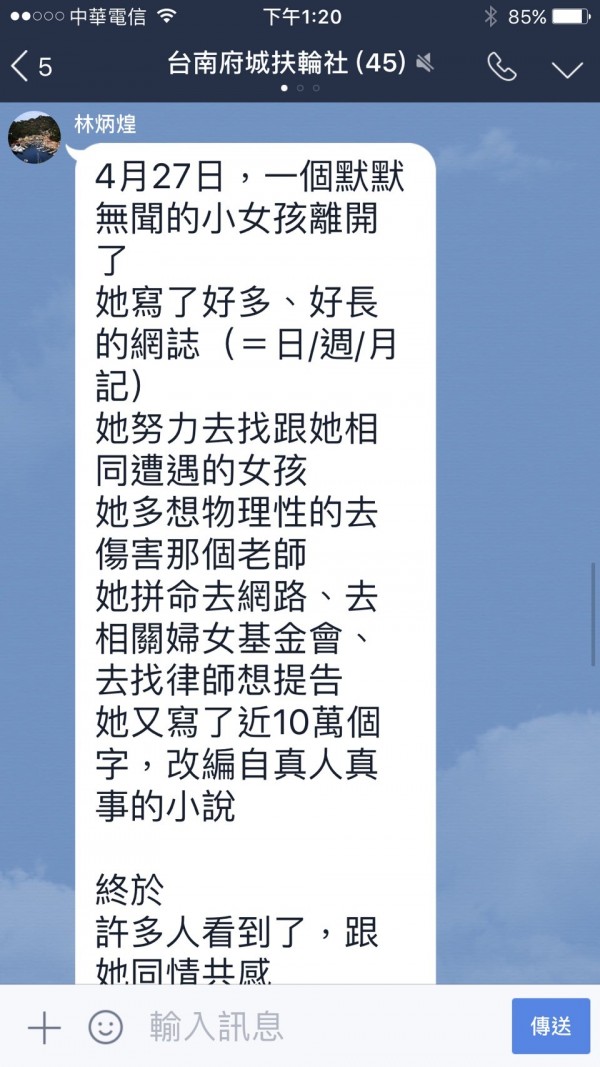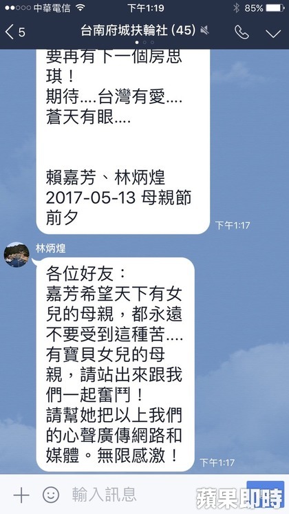 林奕含4月27日輕生離世,昨(12)日在台北市立第二殯儀館舉行告別式,林奕含的父親在告別式上說,無意對他人究責,只希望不要再有「房思琪」。不過今(13日)下午,林奕含雙親於LINE群組中發出第四次