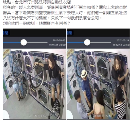 該名網友昨(15日)在臉書怒批,台北市汀州路洗特樂自助洗衣店,有幾個人在攀爬洗衣機,「現在的年輕人怎麼回事,要借用營業場所不用告知嗎?還爬上我的生財器具,當下老闆看到監視器很生氣下去趕人時,他們還一副理直氣壯這又沒有什麼大不了的態度,只放下一句我們是廣告公司。想給他們一點教訓,請問提告有用嗎?」