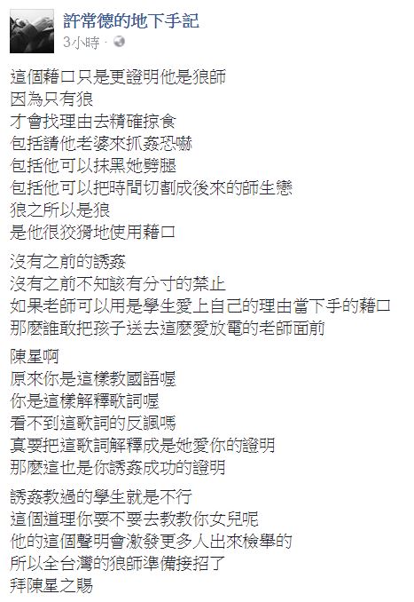 音樂人兼兩性作家的許常德就在臉書對此發表看法,他認為陳星的藉口只是更證明他是狼師,「包括請他老婆來抓姦恐嚇,包括他可以抹黑她劈腿,包括他可以把時間切割成後來的師生戀」。另外對於「歌詞」一事,也讓許常德忍不住酸說,「原來你是這樣教國語喔?你是這樣解釋歌詞喔?看不到這歌詞的反諷嗎?」,直呼「真要把這歌詞解釋成是她愛你的證明,那麽這也是你誘姦成功的證明。」
