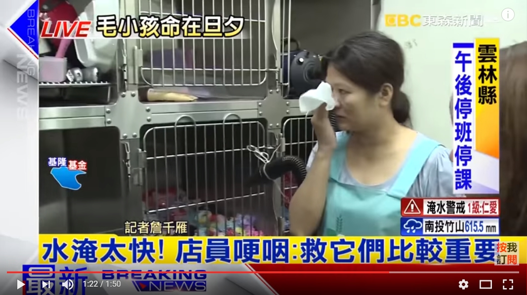 店員回憶起當時水淹進店裡的情景還驚魂未定,受訪表示當時下著大雨,水就突然灌進了寵物醫院,而且積水的高度一度淹過櫃台,深度幾乎淹過成人腰部,店員急壞深怕來不及帶這些寵物逃命,她談到搶救的過程忍不住紅了眼眶「就只能趕快、趕快」「左一隻、右一隻不然怎麼辦?」「就只能趕快把它們帶走啊」。