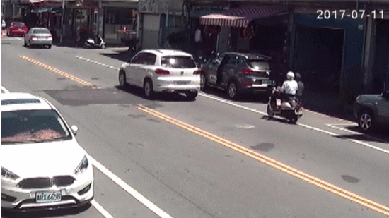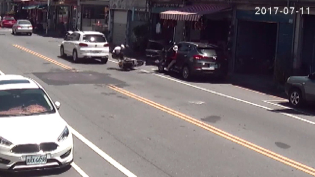 這起意外發生在11日上午10時左右,當時胡姓婦人開著休旅車,載著女兒,臨停在新生路邊,一輛白色轎車經過之後,胡姓婦人完全沒注意到轎車後方,還有一輛機車,猛然地打開駕駛座車門,機車騎士閃避不及,直接被車門打中右側身體,而且連人帶車彈飛到路中央。