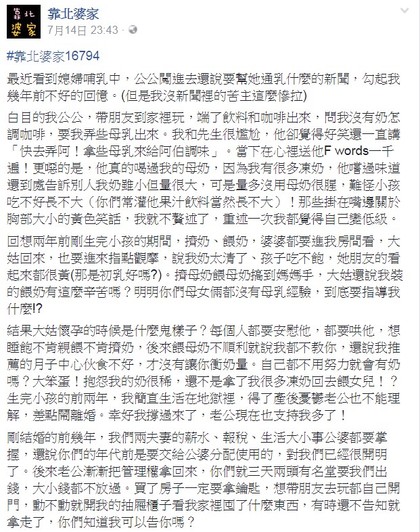 一名媳婦在臉書「靠北婆家」PO文,控訴婆家嚴格控管夫妻的薪水外,還故意去跟鄰居碎嘴說:「你媽媽就是壞就是不會疼小孩」,最噁心的是,公公竟偷喝她的母奶!