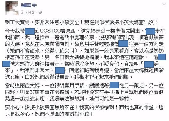 ▼家長PO文大媽拐童組現身賣場,要大家小心!圖/臉書