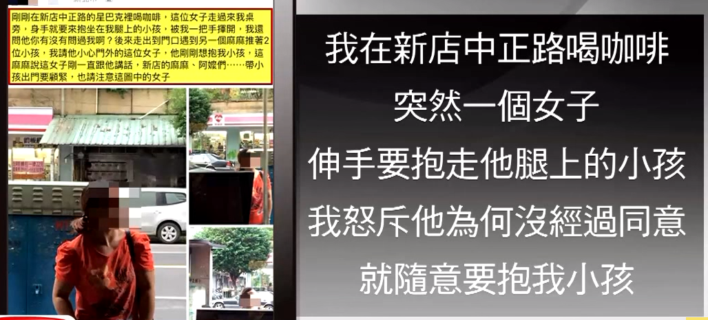 一名母親急著在新店的臉書PO文,表示自己的小孩被陌生女子強行抱走,母親說,在新店中正路喝咖啡,突然一個女子,伸手要抱走他腿上的小孩,怒斥他為何沒經過同意,就隨意要抱小孩,嚇的他趕快PO提醒大家。實地來到這家咖啡店,由於對面就是傳統市場,很多媽媽帶著小孩來買菜,或是在咖啡店前等公車,當天下午,PO文母親就坐在咖啡店內,陌生女子則是走進店內,就直接要強行抱走小孩,還好最後被母親制止,而附近店家也都對這名強抱小孩的女子很有印象。