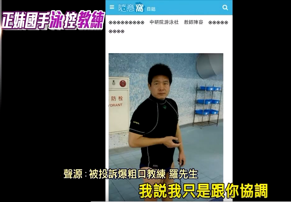 語氣還帶點顫抖,鐵人三項女國手陳培溫,出面控訴帶著朋友,來中研院游泳,竟然被一名羅姓教練言語恐嚇。鐵人三項國手陳培溫:「一開始我口氣也不太好,這個我承認,但是後來他也罵了,很多國罵然後一直問我,我是什麼東西,怎麼不打聽他,他就罵了非常多五字經或三字經。」被點名爆粗口的羅姓教練,頭銜掛的是中研院游泳社的總教練,而出面控訴的女國手,也曾代表台灣參加亞洲沙灘運動會,2011年更拿下ironman的冠軍。從小就喜歡到中研院的泳池練習,非中研院的人,每次只要付費150元,就能自由進出。女國手說,因為朋友曾經差點被水溺死,很怕水,所以她帶朋友先在兒童池練憋氣,熟悉水性,當時泳池裡還有羅姓教練帶著三個小朋友,在兒童池練習,彼此都沒妨礙到對方,不懂羅姓教練為何要他們一定得去大人池游。女國手甚至指控,羅姓教練的兒子後來還撂狠話,讓他心生恐懼,害怕到得去醫院看精神科。
