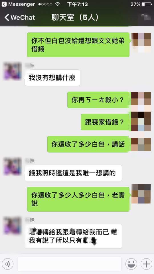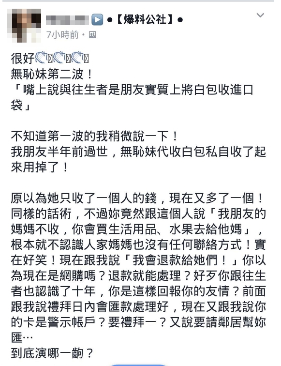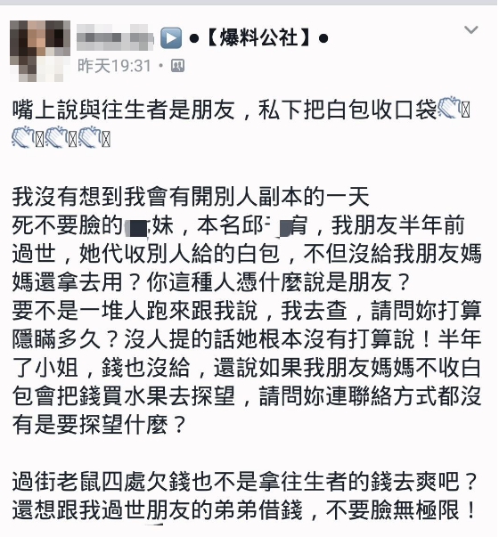 一名網友在臉書《爆料公社》社團憤怒po文表示,一名邱姓女子趁朋友過世時,到處向人說與往生者是朋友,私下向其他人收白包,甚至把得到的錢放入自己口袋,完全沒交給死者家屬。事隔半年,原po經提醒才驚覺此事,並在文中說到:「你這種人憑什麼說是朋友?要不是一堆人跑來跟我說,我去查,請問妳打算隱瞞多久?」並附上群組中與邱女對話的截圖,邱女知道紙包不住火,面對原po的質問,表示自己唯一想講的是錢會照實還,「我的問題!錢我退!各位抱歉!」並進一步坦承,「當初我們沒錢,我們確實有動」,群組內其他朋友看不下去,也跳出來說:「我相信你,把白包匯給你,請你代包,你竟然沒拿給對方」。