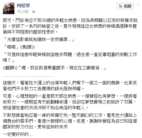 這位女病患讓柯紹華醫師印象非常深刻,他提到「看著世大運上的台灣年輕人們奪下一面又一面的獎牌,也享受著他們汗水努力之後應得的鎂光燈與榮耀。可是,心裡想起的一直是那天那位病患」,他心疼對方忍著背部各種新舊傷,為國家努力付出,「一個曾經也有夢想,一樣拼著命努力,一樣期望有天能翻轉命運,但卻在夢想實現之前就折了羽翼」,即使背部已滿是傷痕,仍咬著牙坐著搬貨的工作。