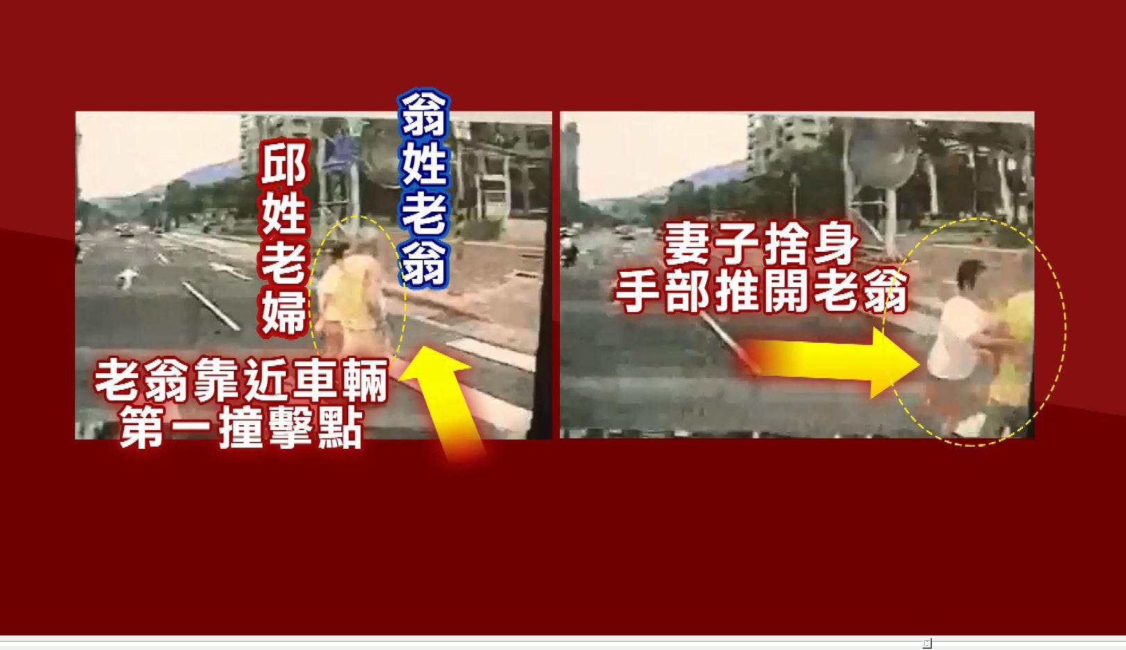 邱姓妻子看到公車已近在咫尺,在短短幾秒鐘的時間,先是奮力地推了站在前方的丈夫一把,讓他脫離撞擊點,這時駕駛想煞車根本來不及,妻子用肉身抵擋車身下,直接遭到嚴重撞擊,還發出一聲嚇人的巨響。